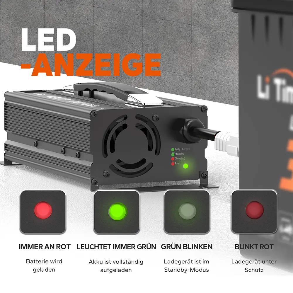 [36V Lithium-Batterieladegerät] Ladespezifikationen: 43,8V | Ladestrom: 18A | Nenn-Eingangsspannung: 100V-240V AC; 50Hz bis 60Hz. LiTime 43,8V 18A Smart LiFePO4-Ladegerät für 36V (38,4V) LiFePO4-Batterien, mit Aktivierungsfunktion für BMS-geschützte Lithiumbatterien.