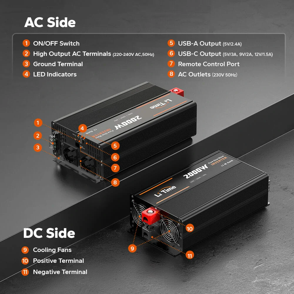 [2000W Reiner Sinus-Wechselrichter Wandelt 12VDC in 220-240VAC um, mit sauberem, stabilem und störungsarmem Stromausgang für den zuverlässigen Betrieb aller Geräte.